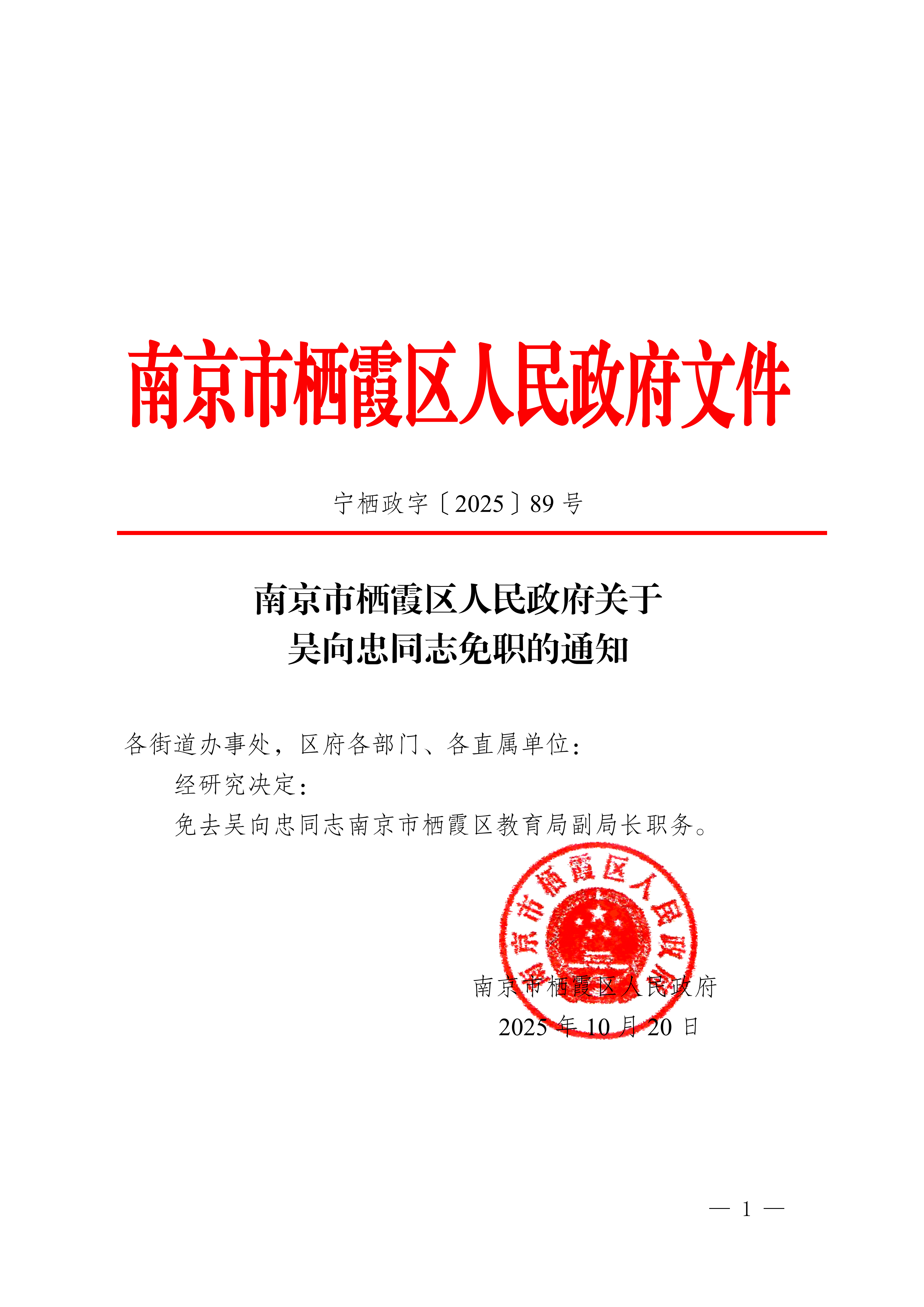 宁栖政字〔2025〕89号 南京市栖霞区人民政府关于吴向忠同志免职的通知