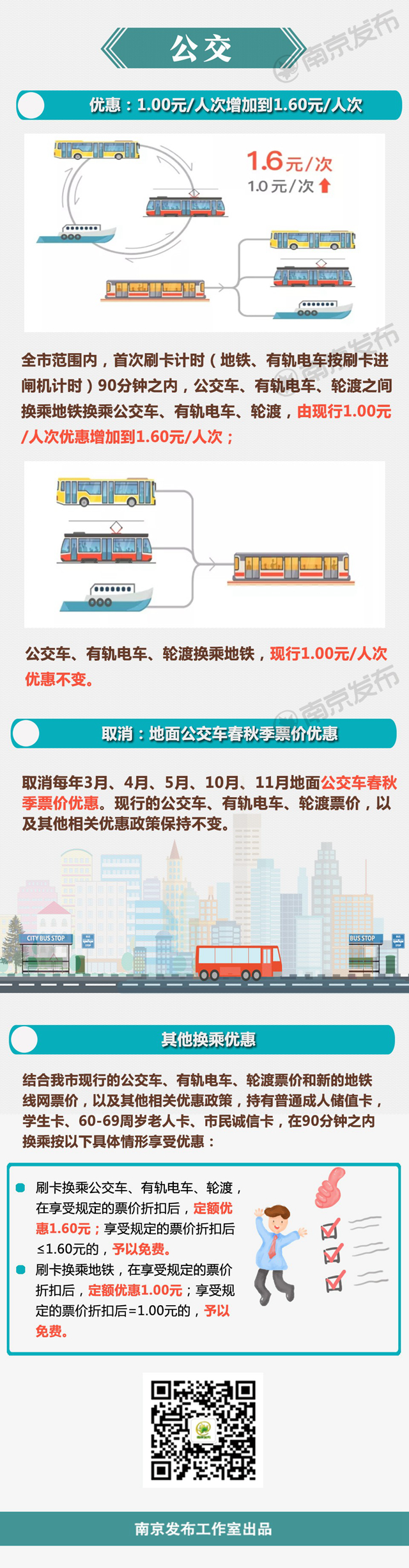 南京自2014年8月1日起,实施公共交通换乘优惠政策,刷卡乘坐公交车、有轨电车、轮渡、地铁,90分钟之内,换乘优惠0.40元/人次;2017年8月1日起,90分钟之内,换乘优惠由0.40元/人次增加到1.00元/人次。